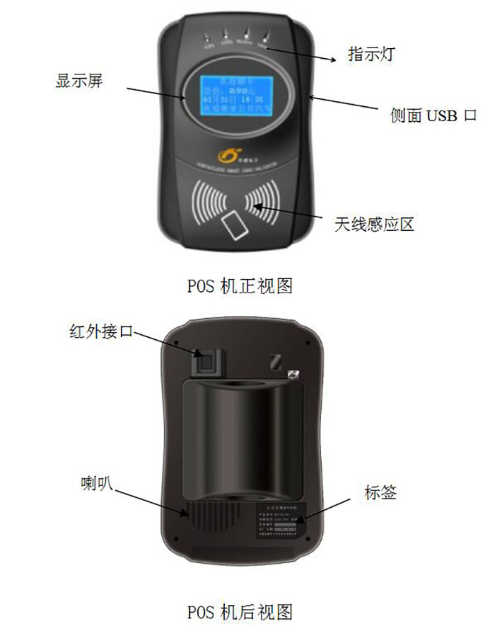 POS机正面上半部有机玻璃透窗区域为显示屏,下部椭园形凹陷区域为天线感应区域。乘客刷卡时需将公共交通卡置于天线感应区内。侧面有喇叭和红外卡接口。最底部是接插口,配置了电源输入接口、通讯接口、CAN总线接口、GPS天线接口等。
